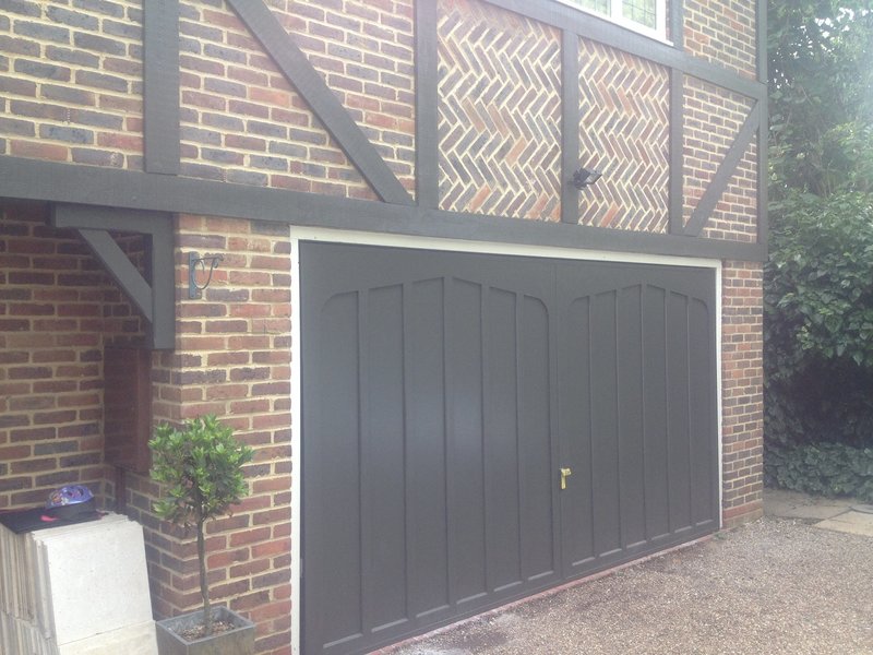 Garage door and beams painted using colour Toad from the Little Greene Paint company